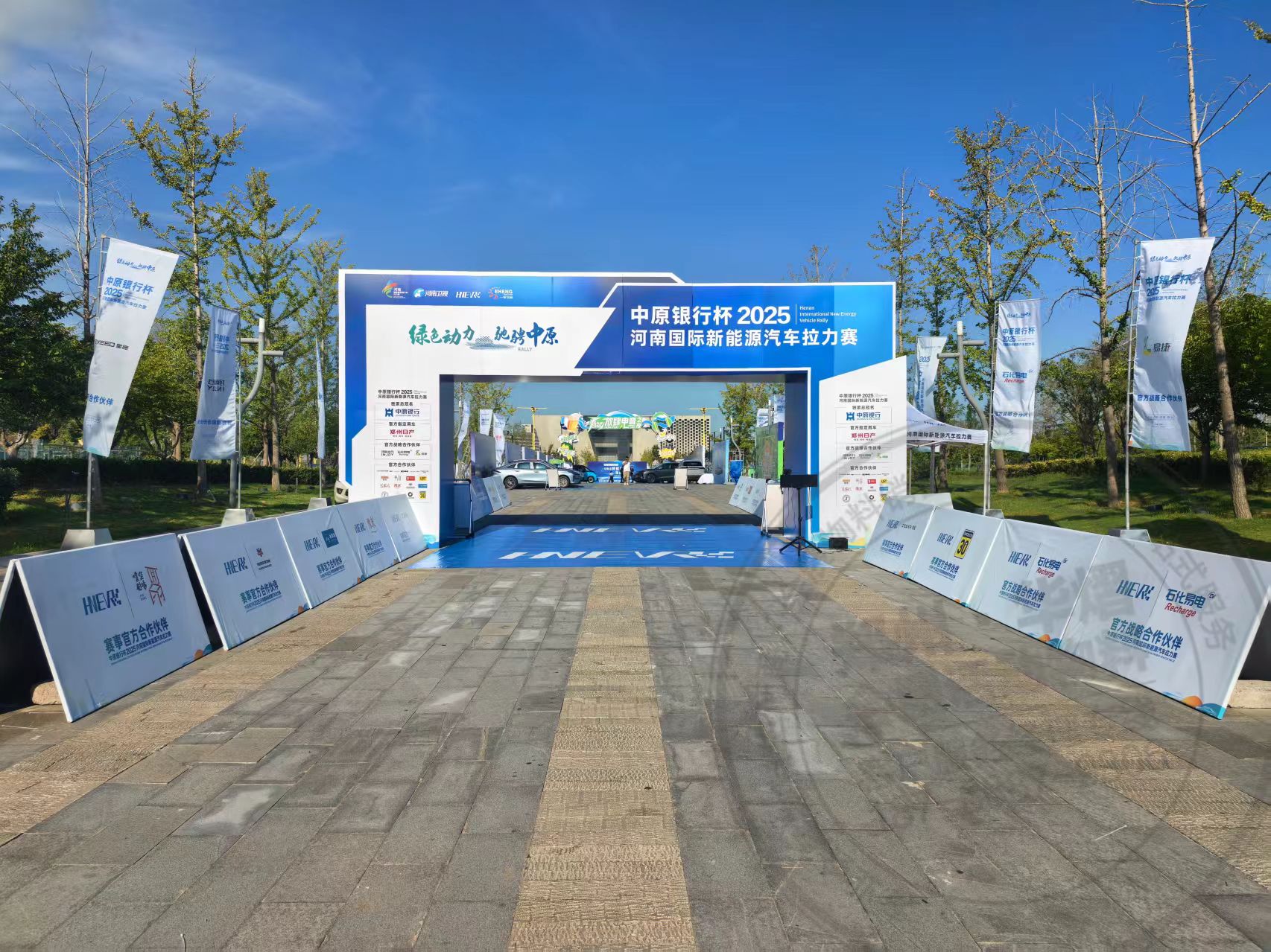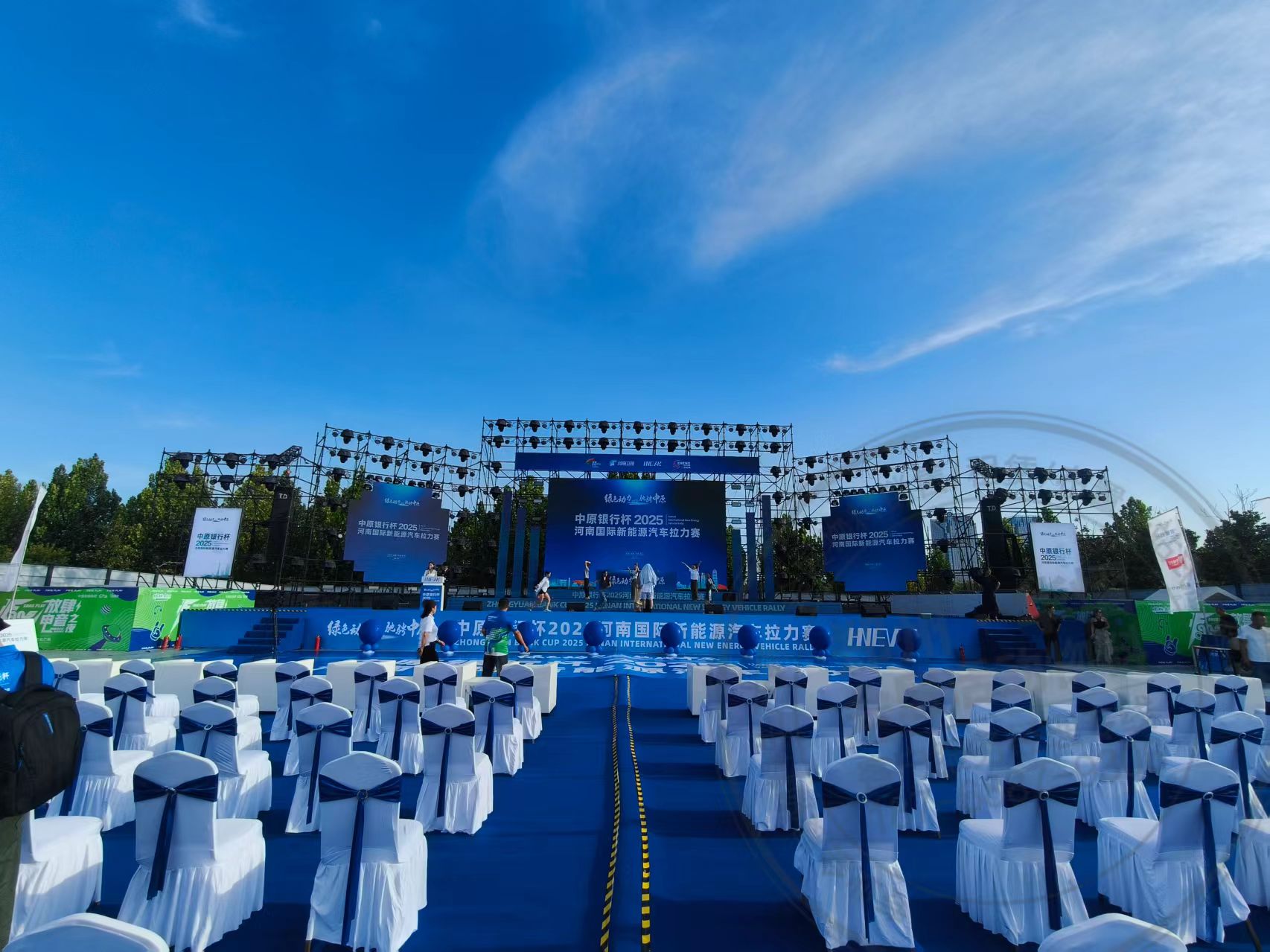 中原银行杯2025--河南国际新能源汽车拉力赛华熠物料出租执行搭建,郑州综合物料落地执行公司,华熠基础物料供应,郑州舞台出租,郑州桌椅沙发租赁,郑州A板租赁,郑州5米梯形道旗出租,郑州一站式物料出租执行搭建公司